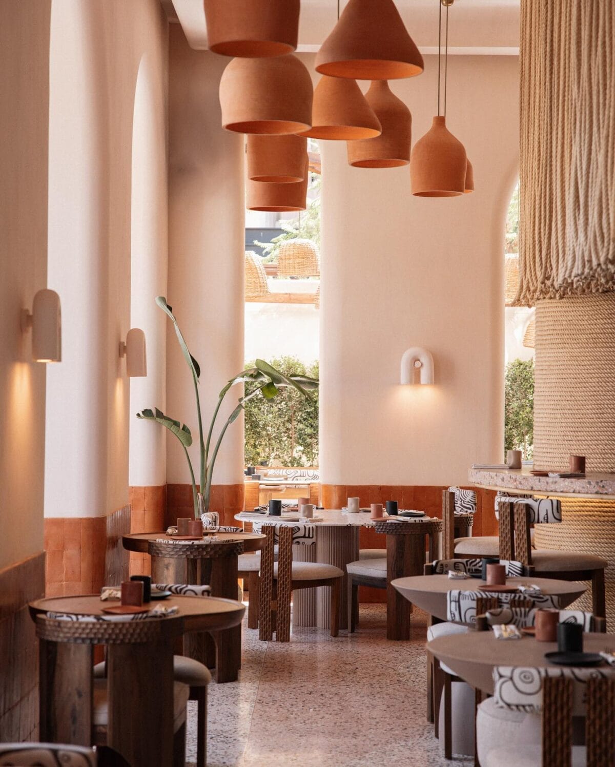 La décoration, conçue par Yacine Sidali, ancien du Studio KO, est un vrai hommage aux matériaux locaux. Le minimalisme domine l’espace, où le terrazzo et la céramique se marient harmonieusement avec des assises en tissu africain. Le bar, orné de cordes, attire immédiatement le regard, tout comme les sept ouvertures arrondies qui symbolisent les sept saints de Marrakech. La vaisselle, avec ses courbes irrégulières, témoigne de l’attention portée aux détails, jusqu’à marqué les verres en céramique de leurs empreintes.