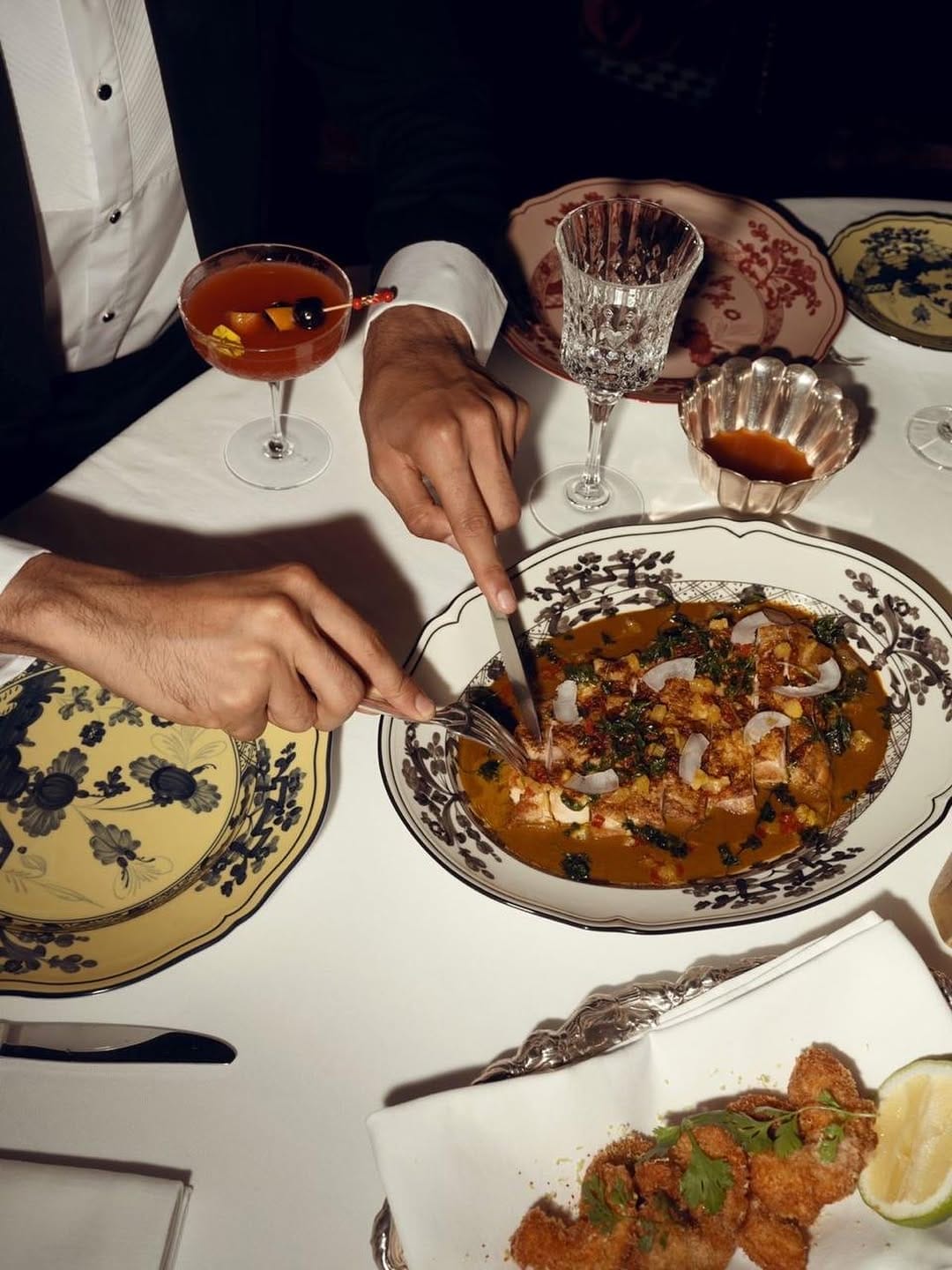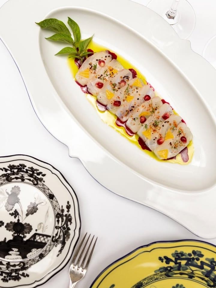 Le décor, revisité par le légendaire Jacques Garcia treize ans après avoir conçu l’hôtel, est un spectacle en soi. Dans une atmosphère feutrée, les zelliges, plâtres sculptés et l’artisanat marocain créent un écrin authentique. Le nom « Sabo » est un clin d’œil subtil aux sabots des pur-sang arabes des écuries du Selman, liant intimement la table à l’âme équestre du lieu. Le détail ultime est le toit ouvrant, qui transforme les dîners en une expérience magique à la belle étoile, sublimée par l’argenterie chinée et les assiettes signées Richard Ginori.